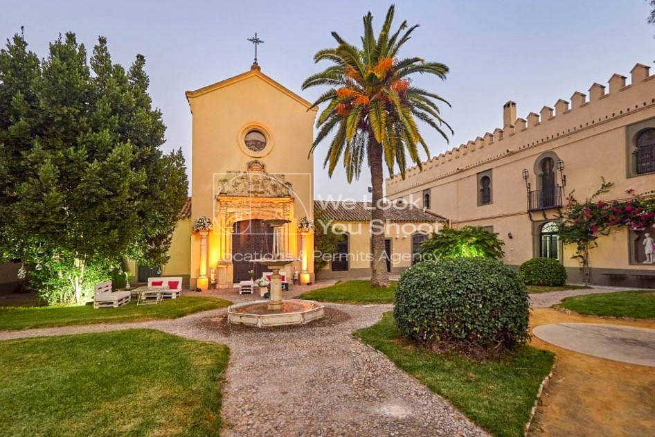 Una majestuosa edificación de estilo clásico, con amplios salones, arcos tradicionales y detalles arquitectónicos que evocan la elegancia andaluza en su máxima expresión