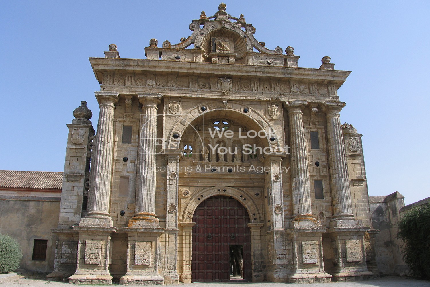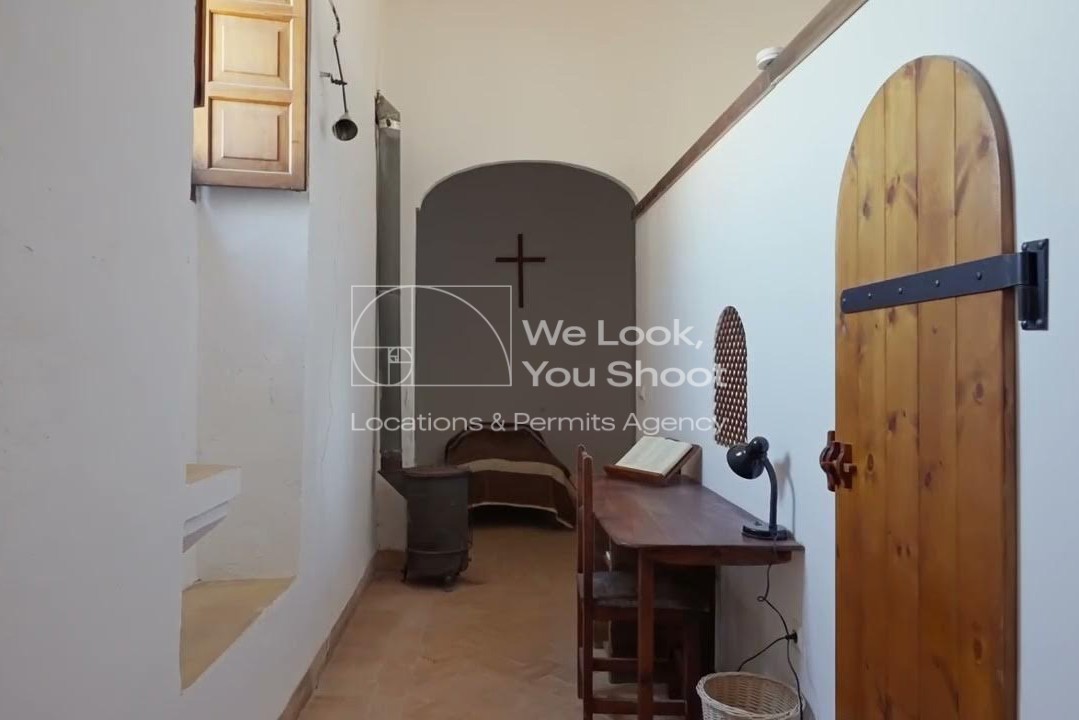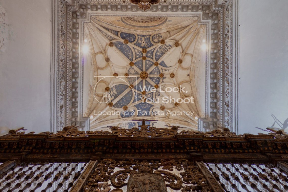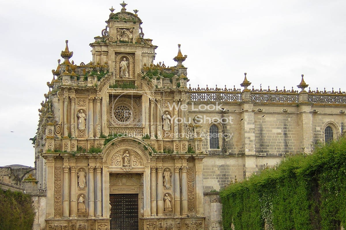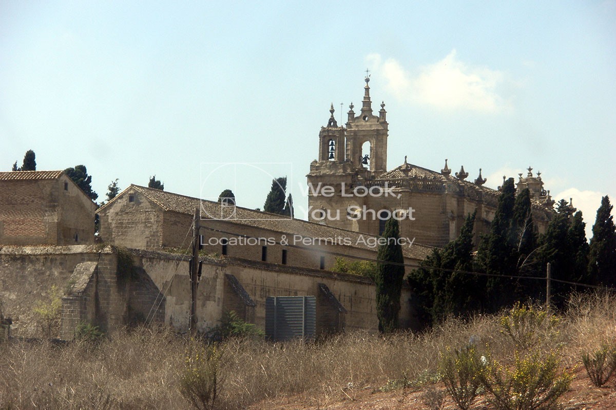 UN COMPLEJO RELIGIOSO MONUMENTAL CON UNA PORTADA DE PIEDRA DE GRAN DETALLE ESCULTÓRICO, CLAUSTROS SILENCIOSOS Y PATIOS EMPEDRADOS RODEADOS DE CIPRESES. LA ARQUITECTURA REFLEJA GRANDEZA Y AUSTERIDAD AL MISMO TIEMPO, CON LARGOS PASILLOS DE PIEDRA Y JARDINES MONÁSTICOS