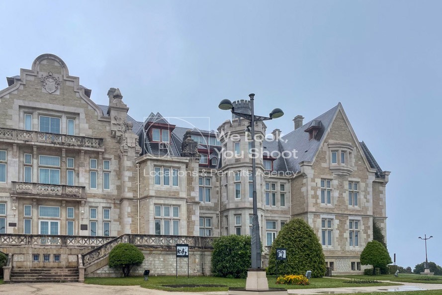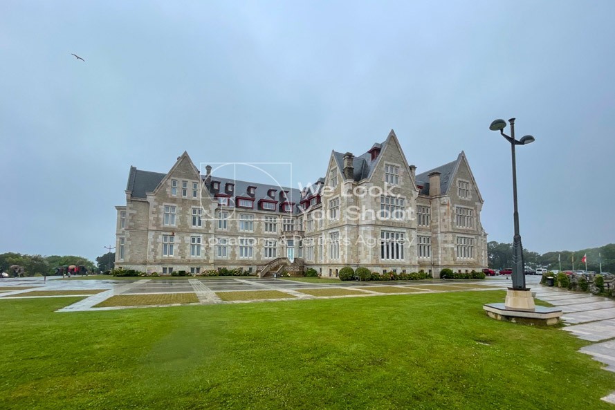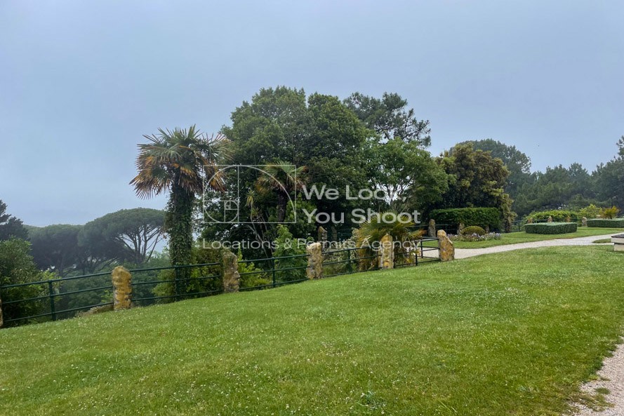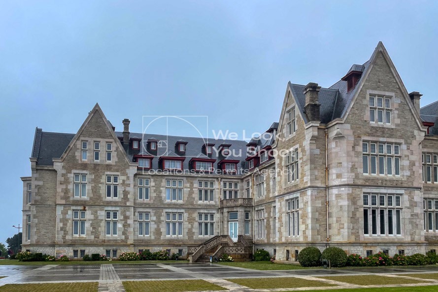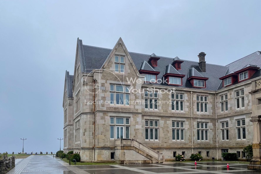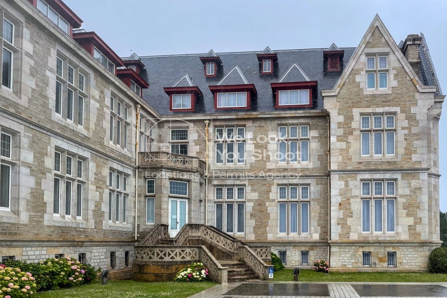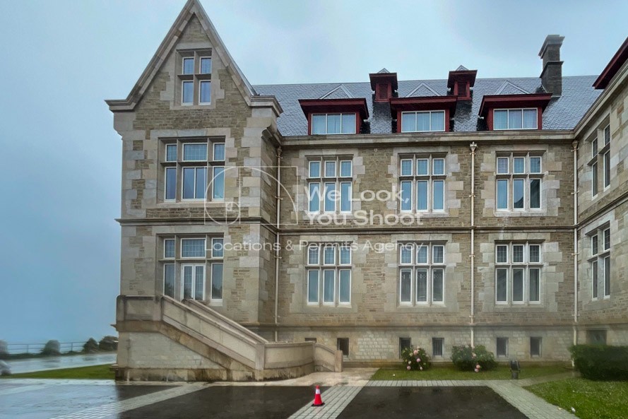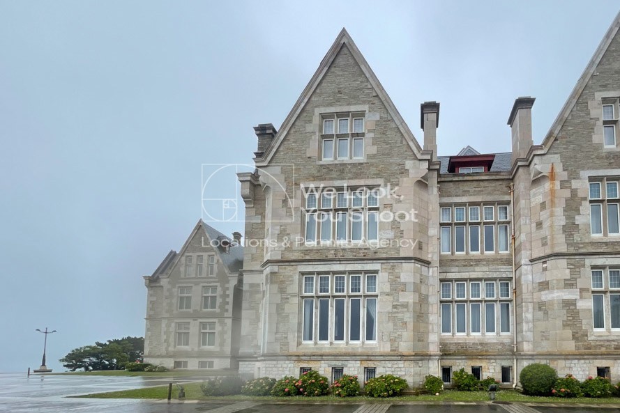 Un majestuoso edificio rodeado de exuberantes jardines y vistas panorámicas al mar, con elegante arquitectura y detalles históricos, incluyendo interiores de madera que aportan calidez y distinción al espacio