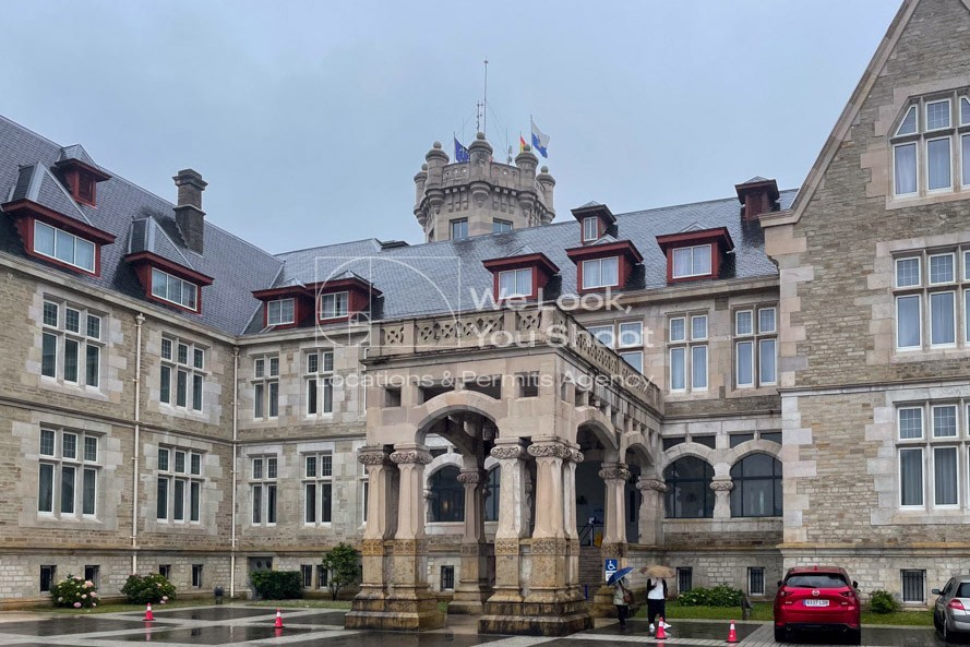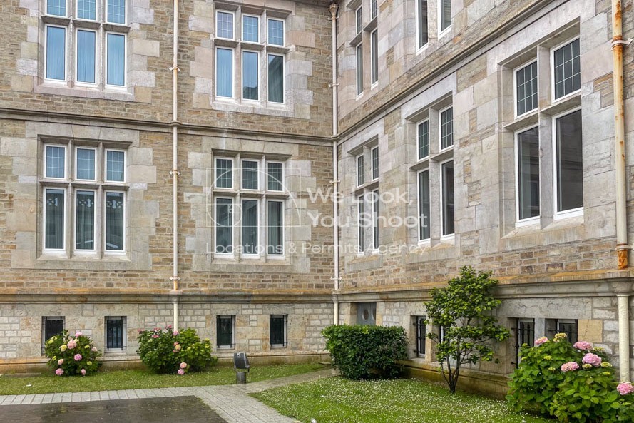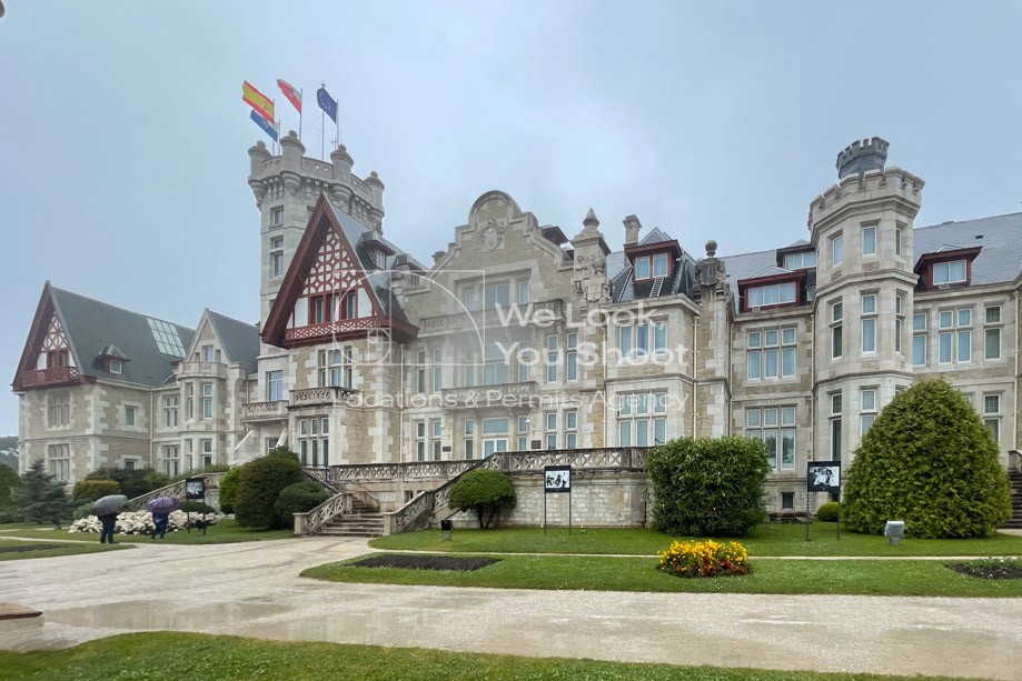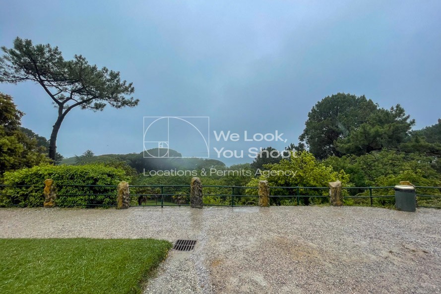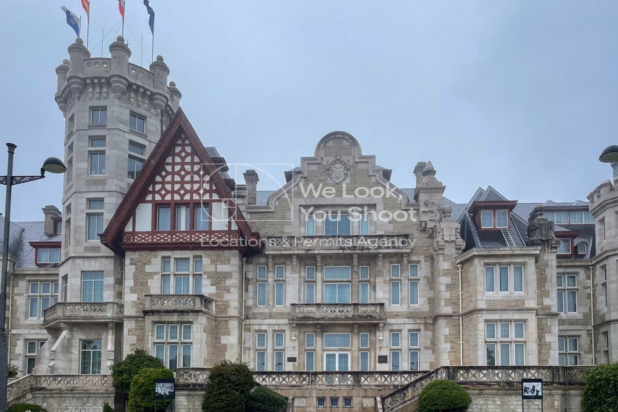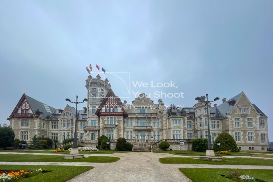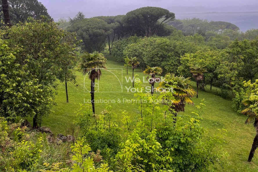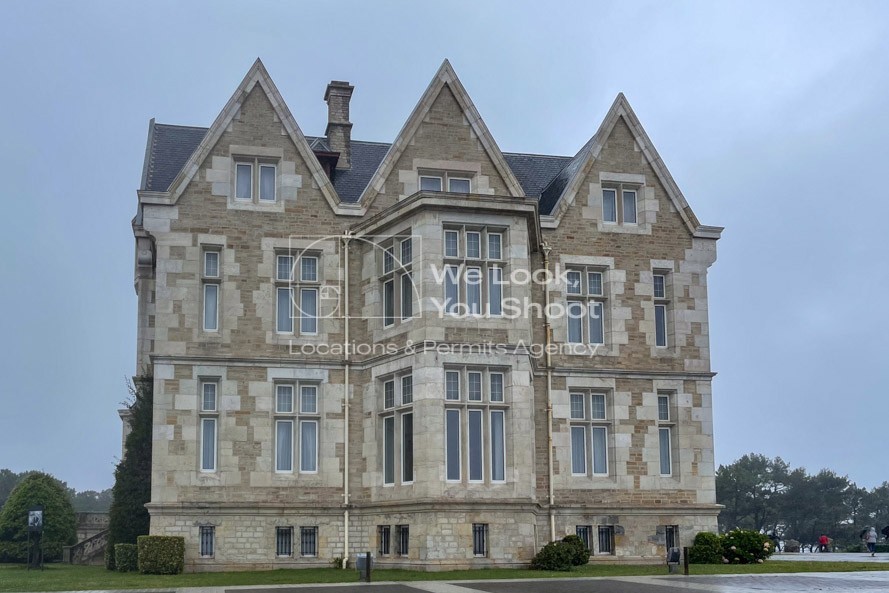Un majestuoso edificio rodeado de exuberantes jardines y vistas panorámicas al mar, con elegante arquitectura y detalles históricos, incluyendo interiores de madera que aportan calidez y distinción al espacio