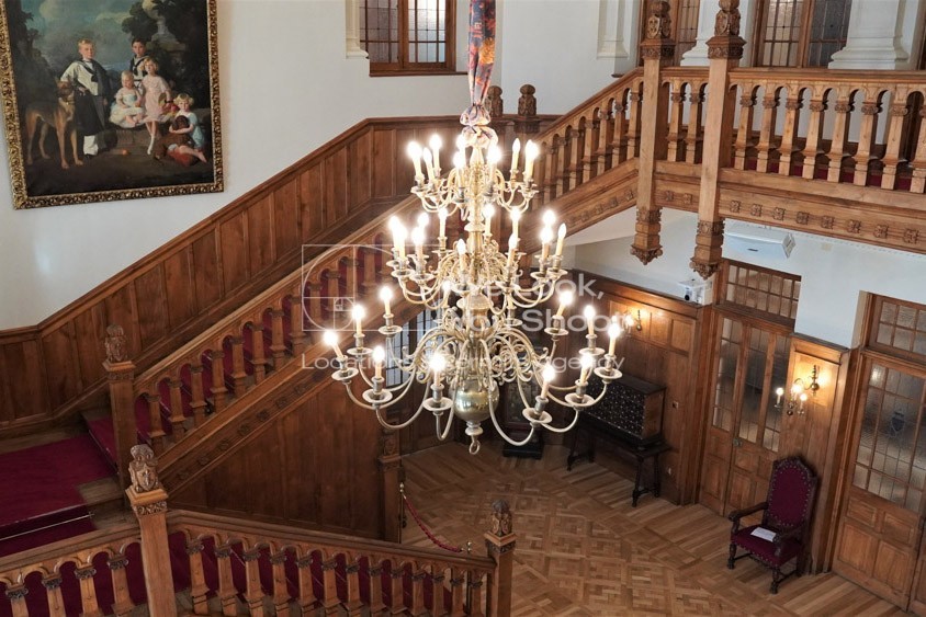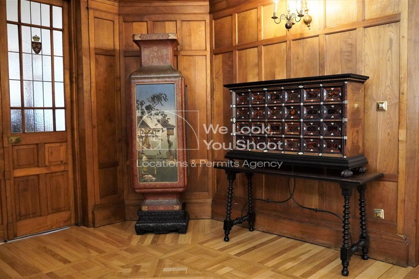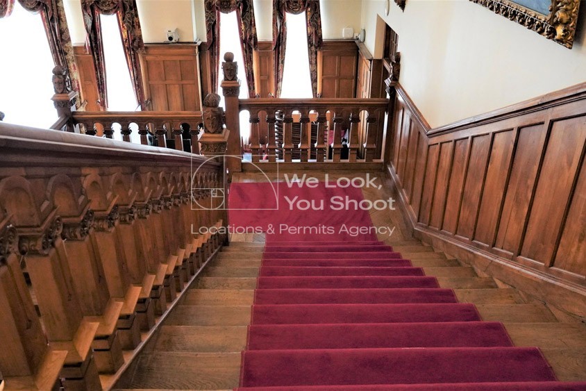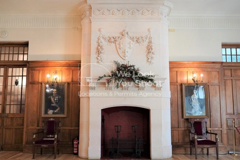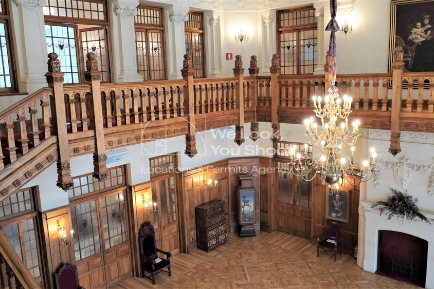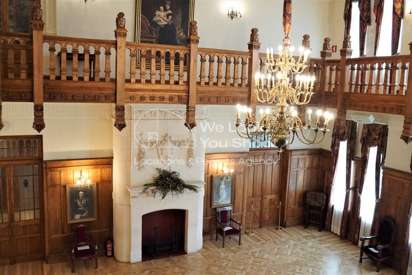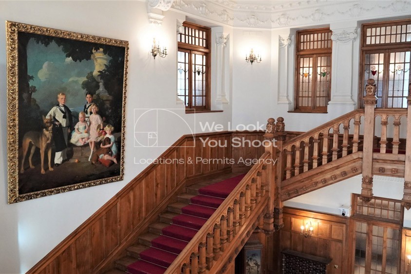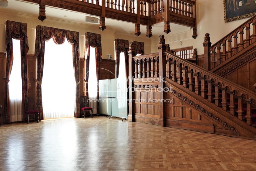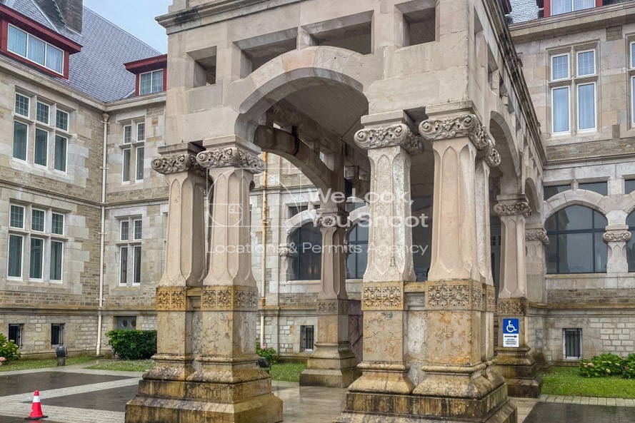 Un majestuoso edificio rodeado de exuberantes jardines y vistas panorámicas al mar, con elegante arquitectura y detalles históricos, incluyendo interiores de madera que aportan calidez y distinción al espacio